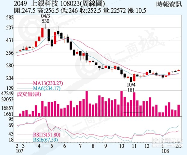 上銀科技1月合并營(yíng)收16.67億元,雖出現(xiàn)近21個(gè)月新低,但法人樂觀自動(dòng)化設(shè)備需求會(huì)從年中開始回溫,對(duì)上銀滾珠絲桿、直線導(dǎo)軌等傳動(dòng)組件需求也增溫,外資及自營(yíng)商上周五合計(jì)買超505張,帶動(dòng)股價(jià)上漲5.5元、收252.5元,周漲幅4.33%,收復(fù)周、月及季線。
